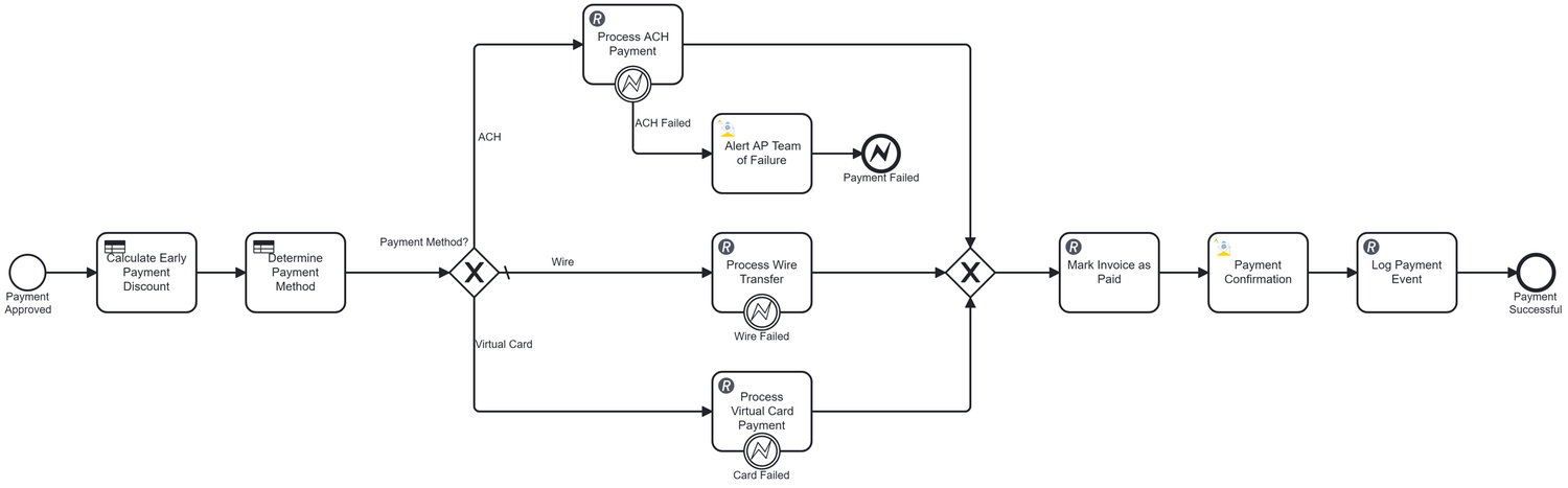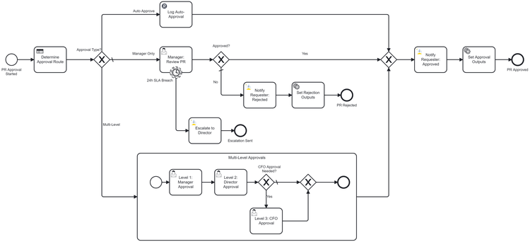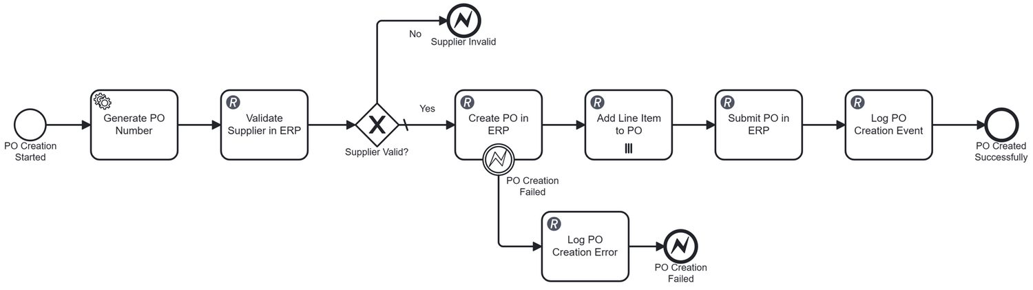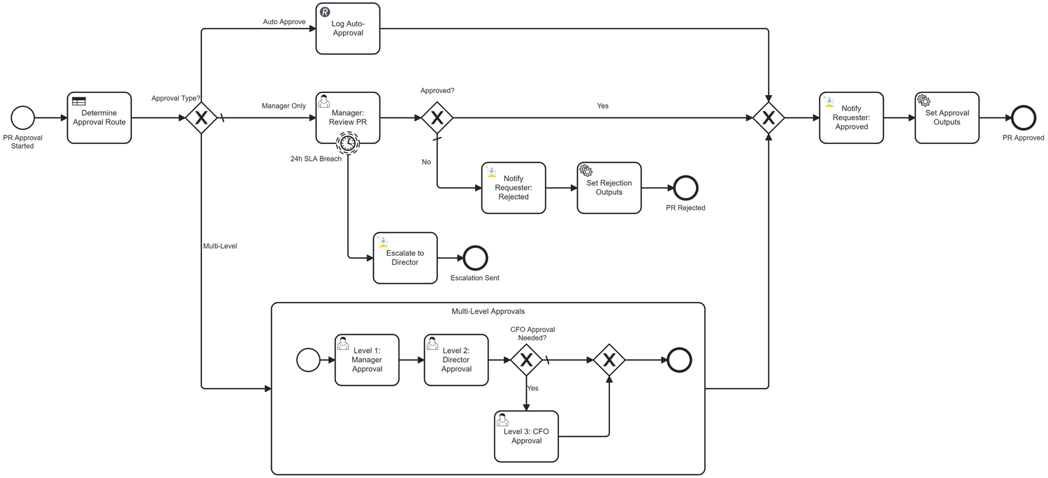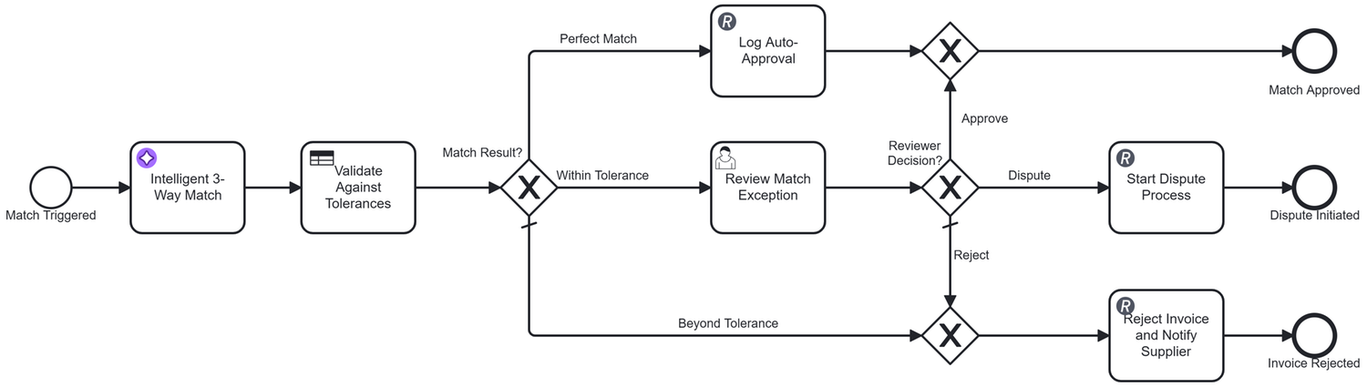 This is a comprehensive Procure-to-Pay automation platform built on Camunda that orchestrates the complete procurement lifecycle for CPG and manufacturing companies. The solution features AI-powered purchase requisition classification (GPT-4o-mini), dynamic approval routing via DMN decision tables, intelligent document processing for invoice extraction (AWS Textract + Claude Haiku), and AI-driven three-way matching (GPT-4o) that automatically validates purchase orders, goods receipts, and invoices. With seamless ERPNext integration, quality inspection workflows for food-grade materials, automated payment method selection, and early discount capture, the platform reduces procurement cycle time by 75%, eliminates manual data entry, and provides complete audit trails through OpenSearch. The multi-tenant architecture supports configurable approval thresholds, SLA tracking, and industry-specific compliance requirements, delivering measurable ROI through process automation, error reduction, and accelerated cash-to-cash cycles.